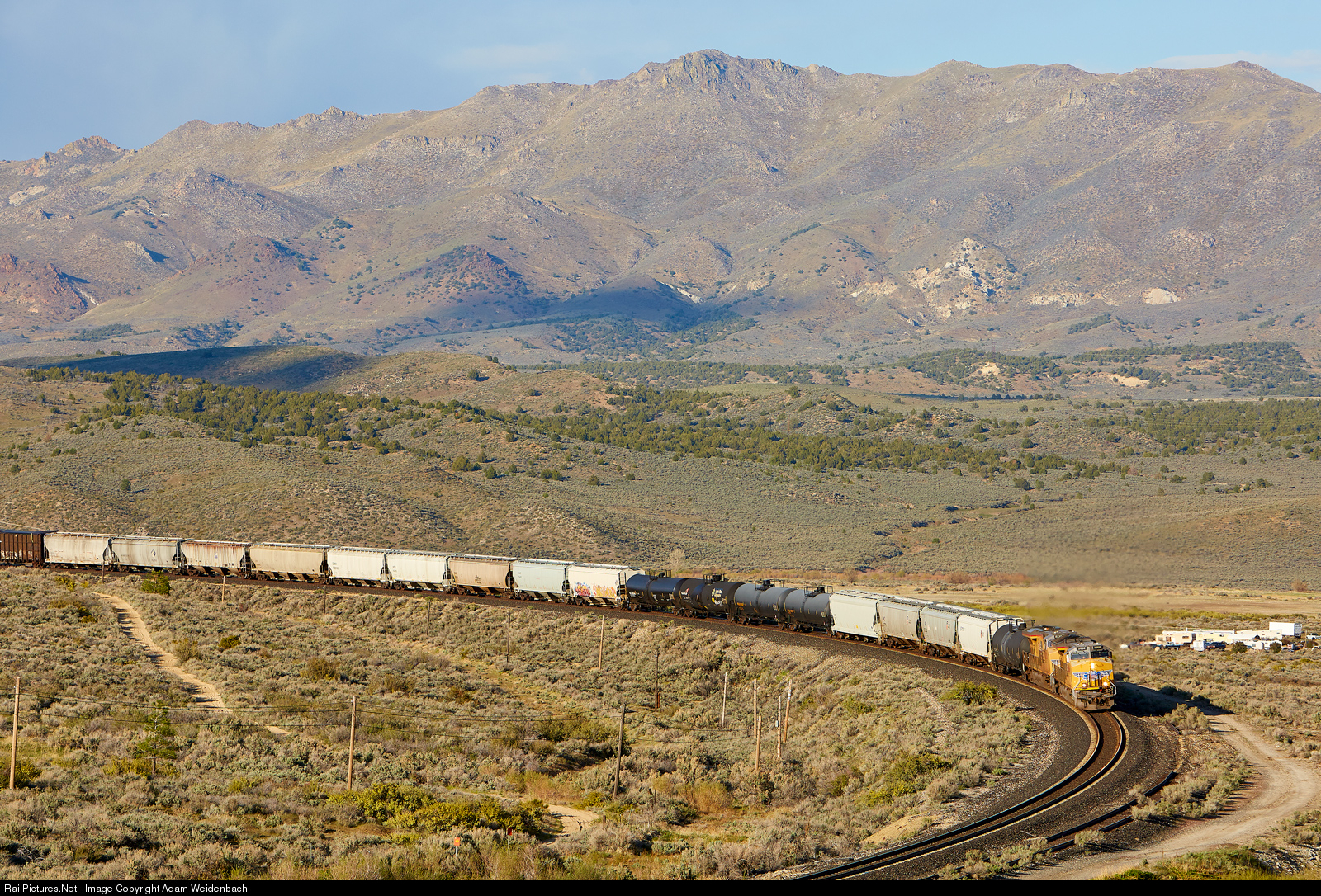This was a lucky find giving the small number of trains on the old WP route. WB manifest rolls into the sweeping curve and into the tunnel at Reno Junction. She also had two units helping mid-train.