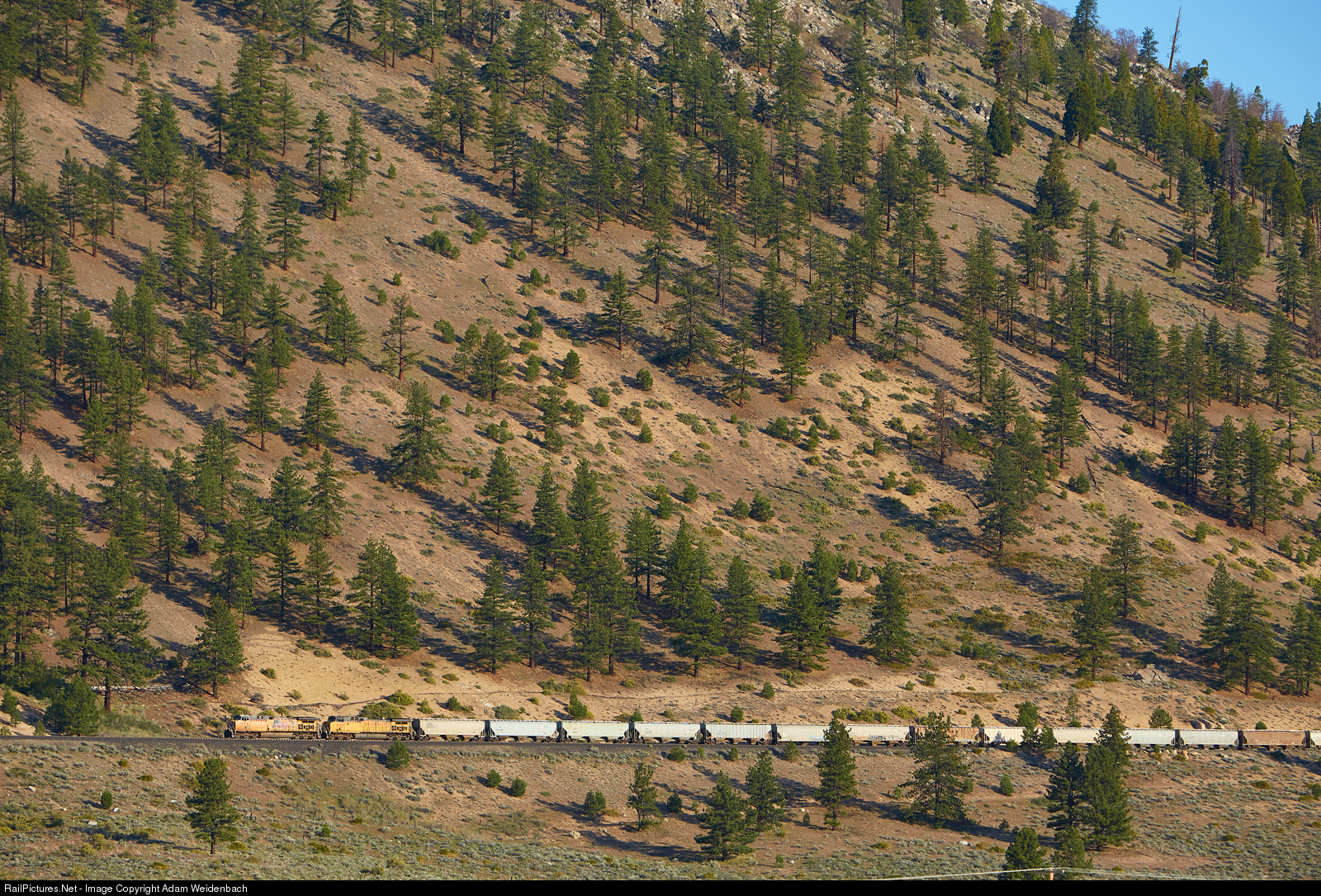 | Another lucky one. Driving just south of Doyle, I found this monster WB grain drag just as the sun came over the Nevada mountains. She was 206 cars long with 3 mid-train helpers 102 cars back and one unit helping on the end.