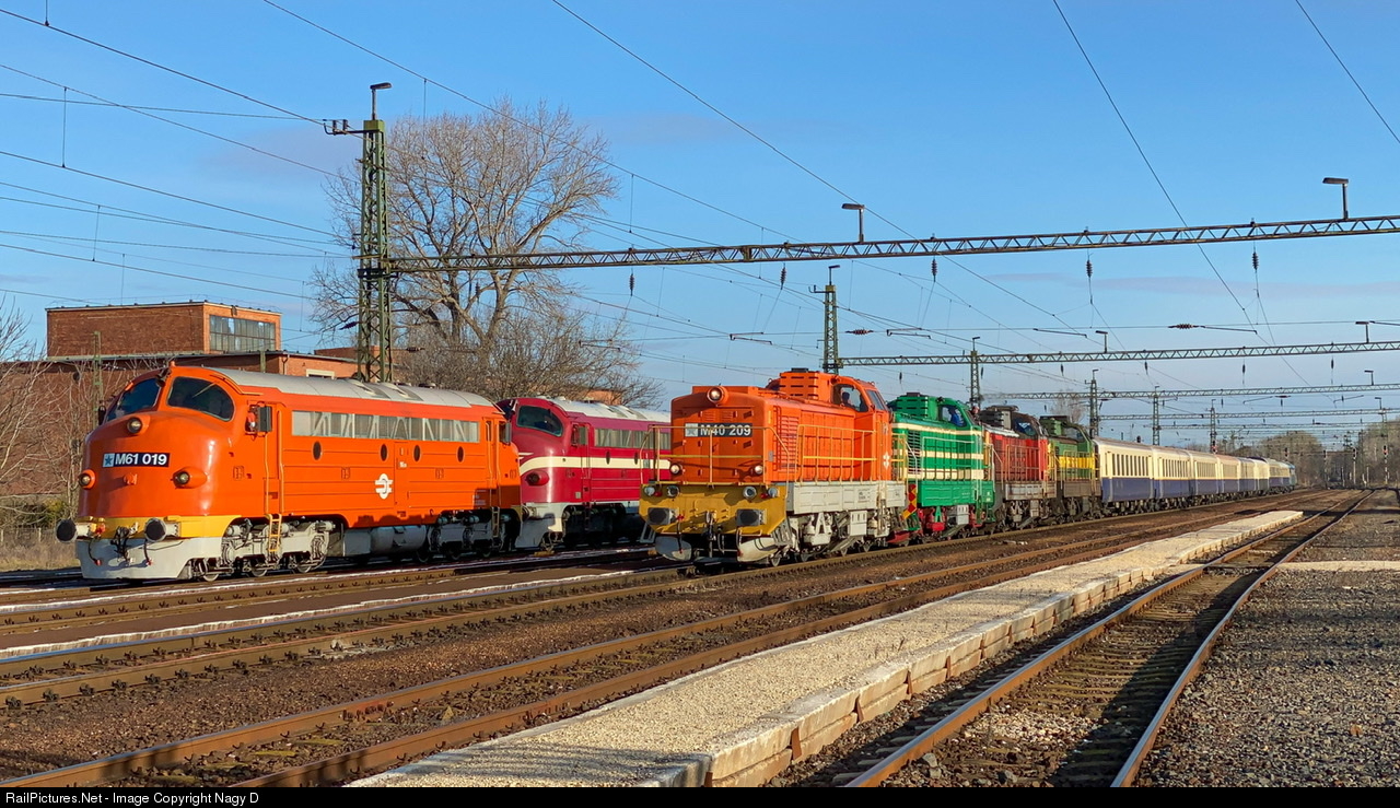 | Two special trains from Budapest to Tapolca are passing Szabadbattyán station. The event was organized to commemorate two famous locomotives of the Hungarian State Railways, the M61 “Nohab” and the M40 “Púpos”. |