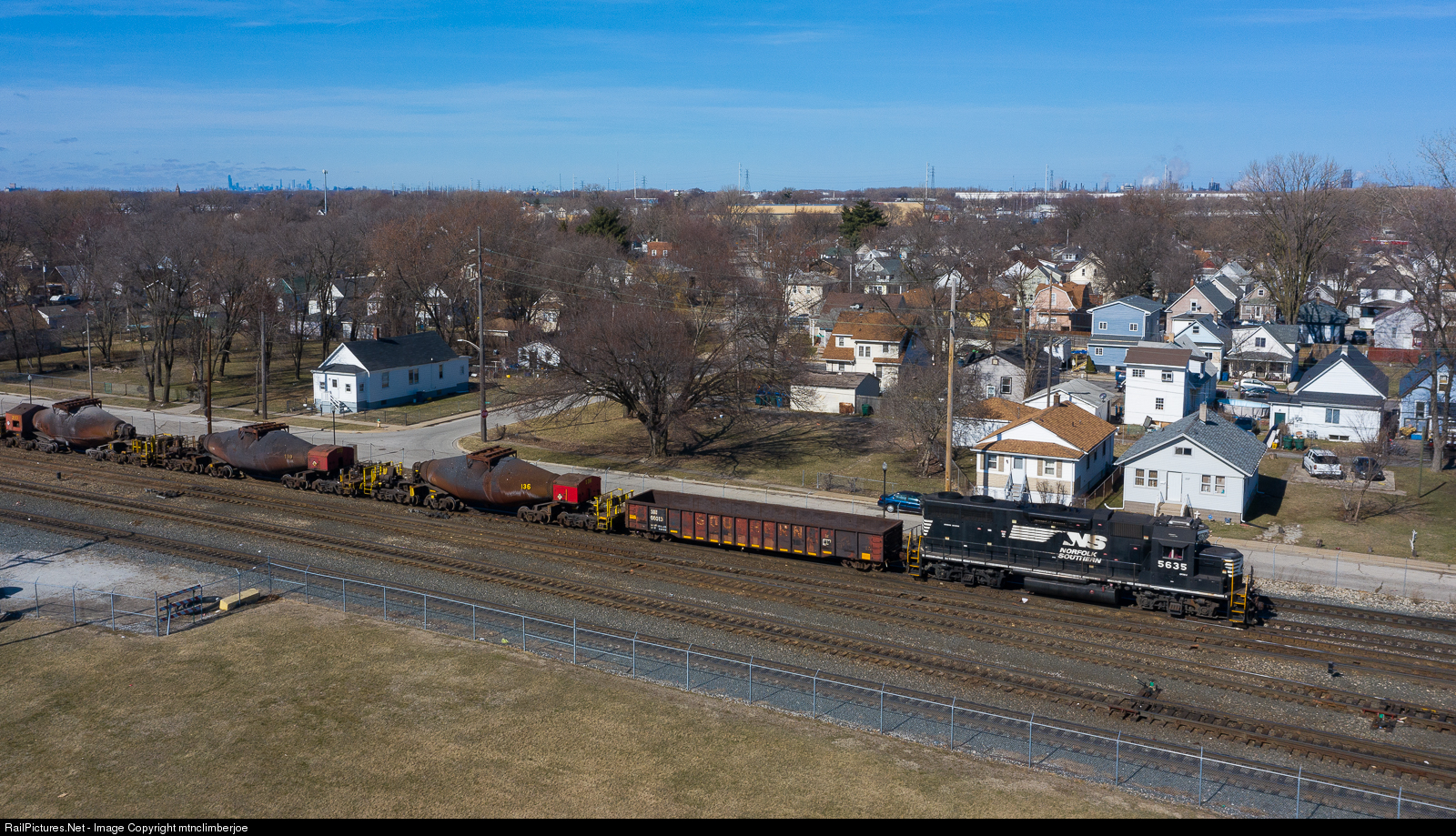 | Norfolk Southern GP38-2 5635 leads an empty bottle train along the IHB Main Line, passing through CP Ryan on the west end of the IHB's Gibson Yard in Hammond, Indiana. This train is bound for the Arcelor Mittal's Indiana Harbor Plant where it will be reloaded. |