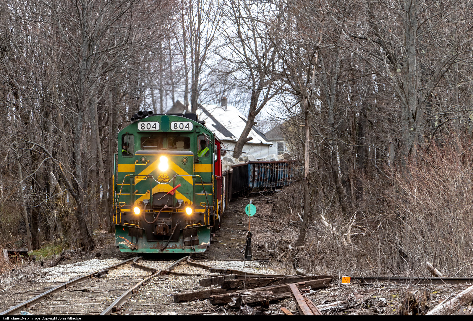 | Green Mountain GP9R 804 eases its train of loaded granite cars down the steep gras of the Washington County Railroad's Montpelier and Barre line headed for the NECR interchange in Montpelier. |
