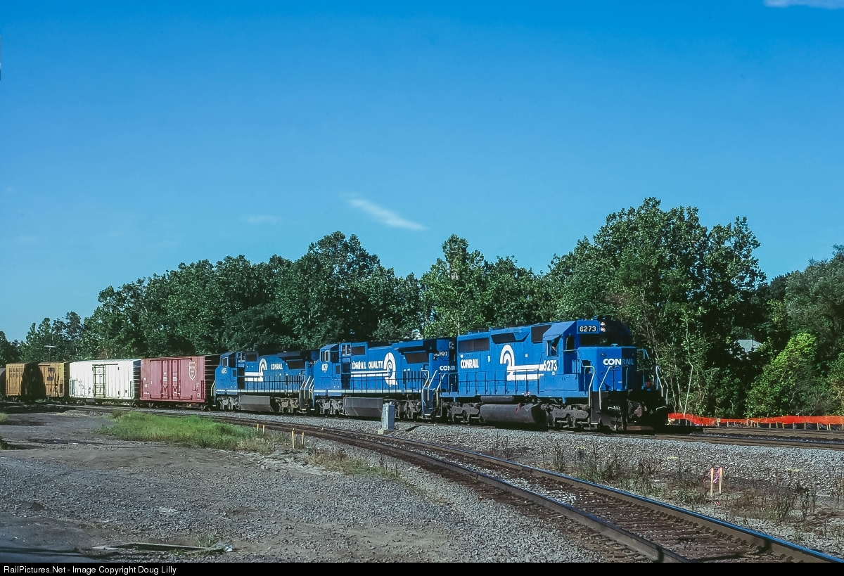 | A thirty-year-old SD40 leads two one-year-old C40-8W’s on the final approach to Allentown Yard at East Penn Junction, Pennsylvania. |