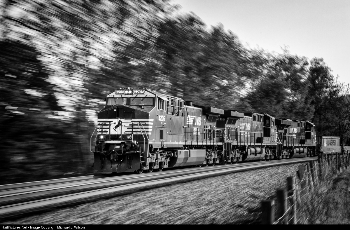 | NS AC44C6M #4206 flies east down Christiansburg Mountain bound for Roanoke, VA on the former Norfolk & Western Christiansburg Division. Zoom pan shot at 1/10th. |
