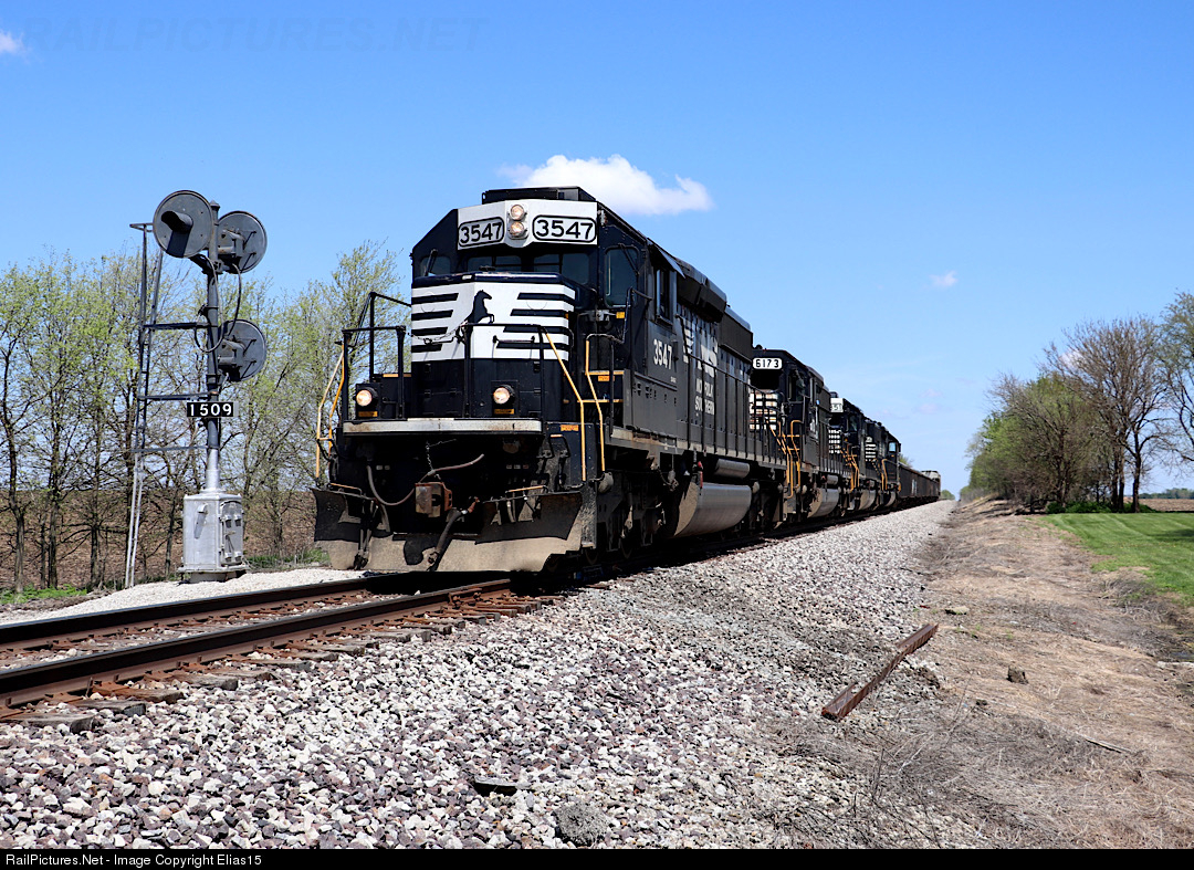 | NS 3547 leading it’s train past a set of signals just South of Monticello. The train will stop at the next town to the South and drop of two of it’s units for another train to use. |