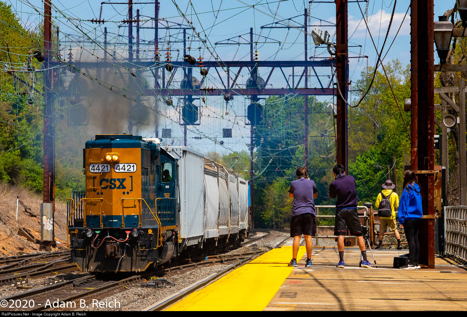 A group of railfans photographs CSX GP40-2 #4421 as it lets out an impressive belch of exhaust while hauling Conrail Shared Assets ME-2 through Metuchen Station on May 7, 2020.