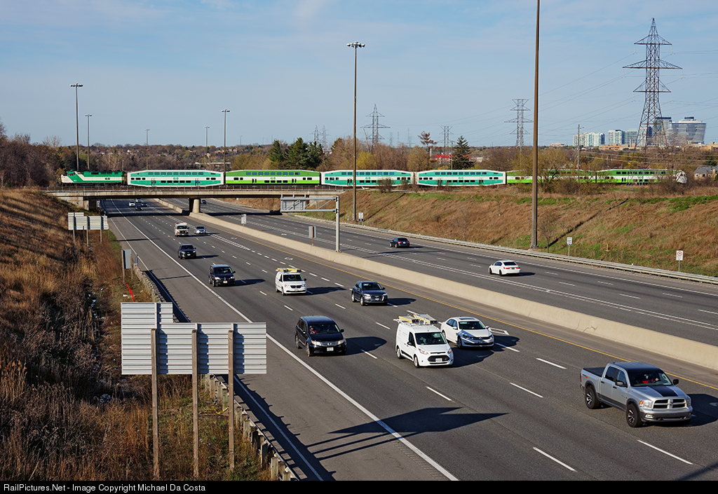As traffic on the 403 below keeps up the light pace, the second last morning GO train rolls across bound for Toronto.