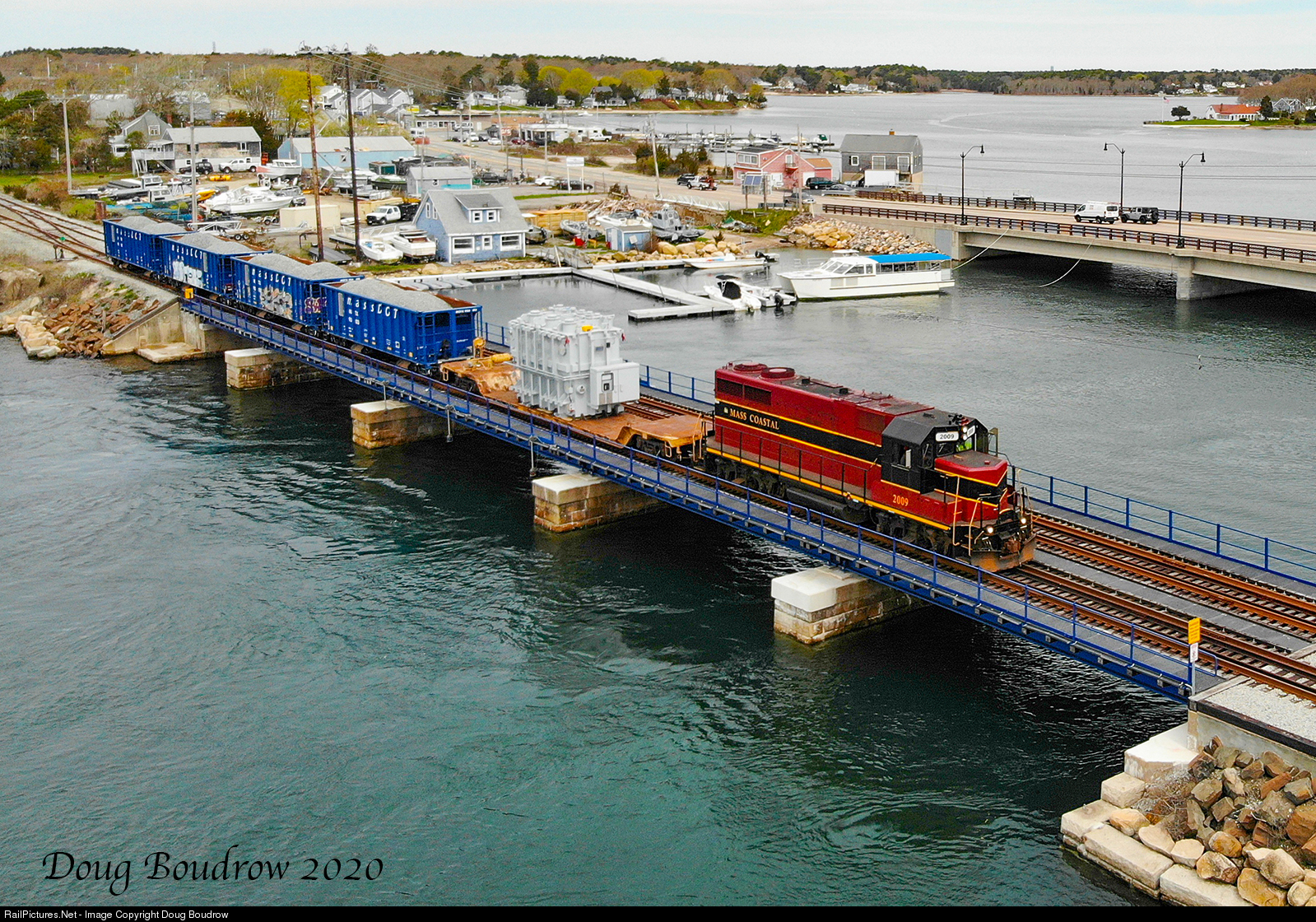 On May 8th, 2020 Mass Coastal Railroad ran an extra train to Hyannis. The train included four hopper cars that dumped ballast at points along the way. More interesting was a depressed flatcar behind the locomotive carrying a large transformer that was to be unloaded at Hyannis. The train is seen passing Cohasset Narrows approaching Buzzards Bay. The 1964 GP28 was originally built for the Illinois Central. There are very few surviving examples left.