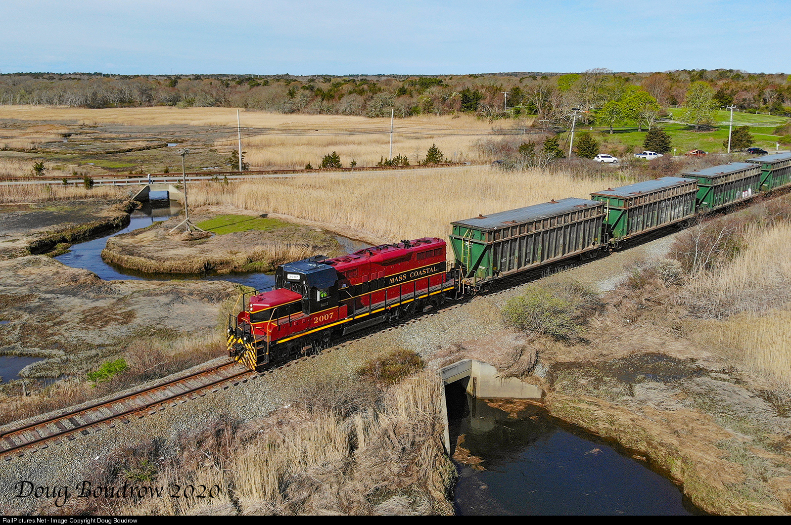 | Mass Coastal Railroad operates the energy train five days a week. The empty train travels from Rochester onto Cape Cod where it picks up trash from a facility in Yarmouth. The loaded train returns to Rochester where the trash is burned to fuel a power plant. The empty train is known as MC-1 while the loaded train is MC-2. An earlier than usual MC-1 is seen passing the Great Barnstable Salt Marsh in West Barnstable. The GP9 was built new in 1956 for the Atchison, Topeka and Santa Fe Railway. |