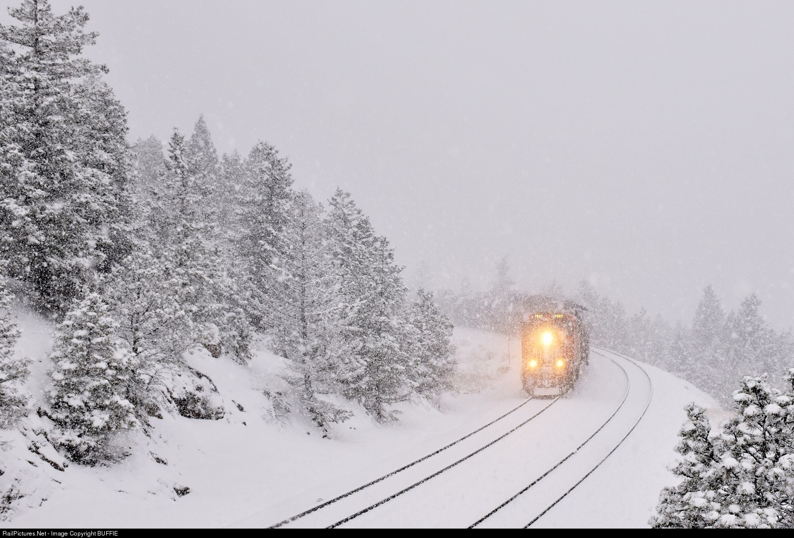 | In what was one of the last major snowfalls of the year in the Colorado Rocky Mountains, BNSF 7277 (ES44DC) leads an oil can train around the Crescent curve as it heads to Denver. |
