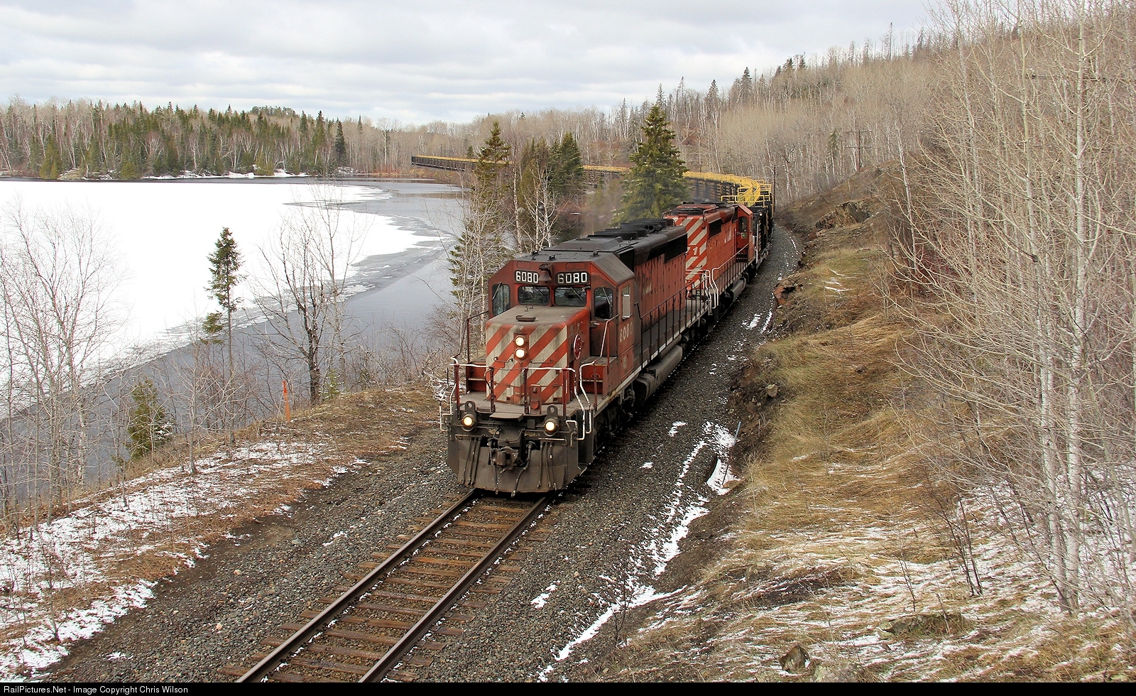 | On a somewhat gloomy spring day (in the middle of a polar vortex to boot) a pair of veteran SD40-2's pull a Winnipeg, MB - Chapleau, ON loaded rail train around the shore of Cache Lake. |