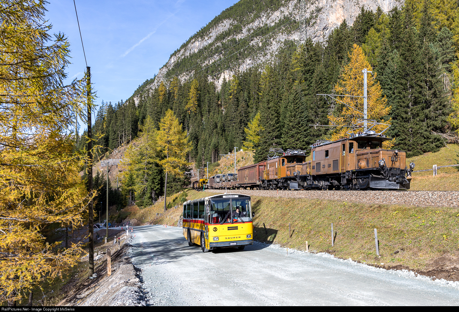 Photo freight train on the Albula line and an old SAURER PTT bus.