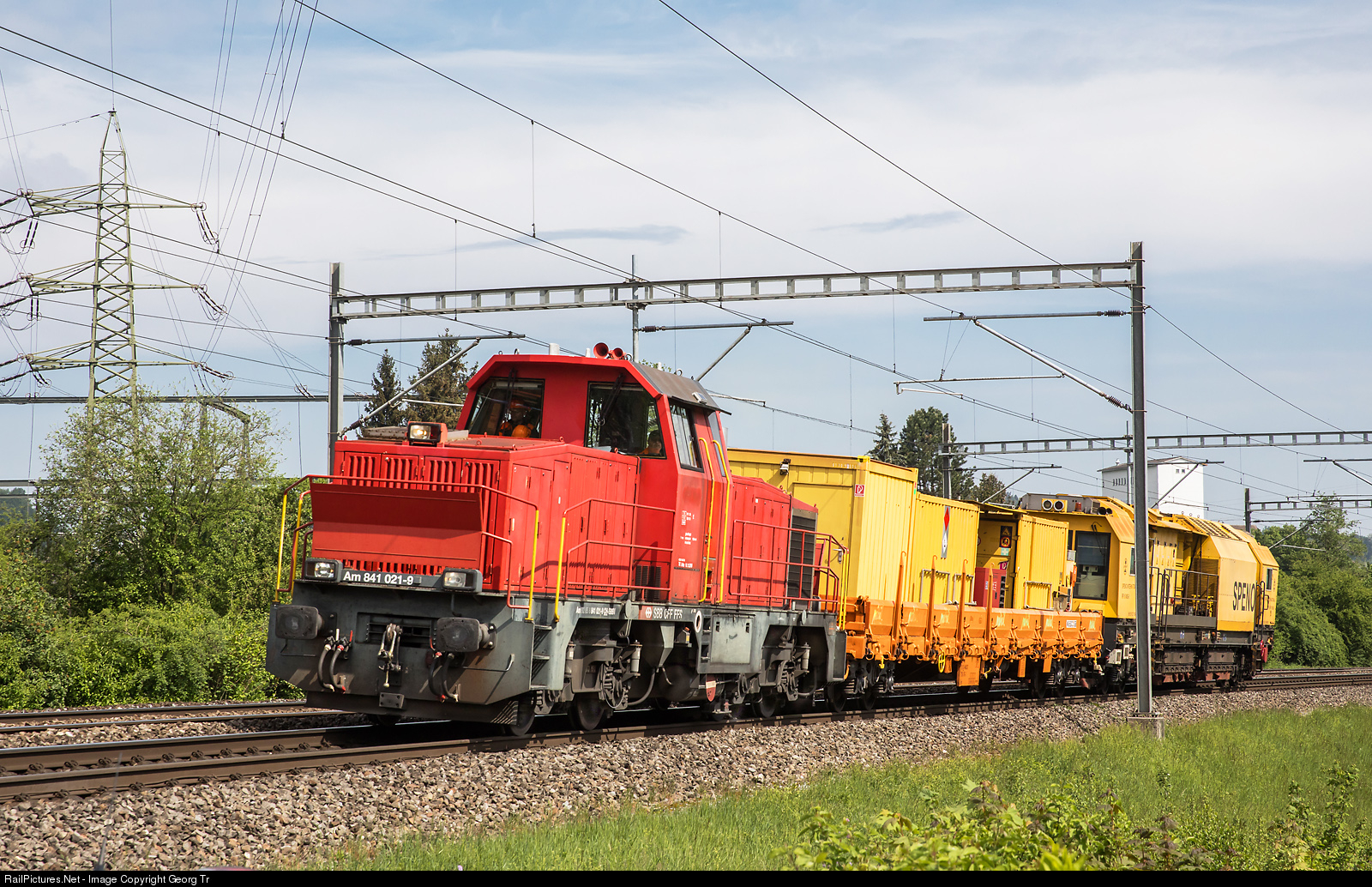 | Diesellocomotive Am 841 # 021 of SBB infrastructure is pulling an orange tools car and the SPENO INTERNATIONAL rail grinding train RR 16 MS-8 from Weinfelden to the Limmattal shunting yard, between Winterthur and Winterthur Tössmühle. |