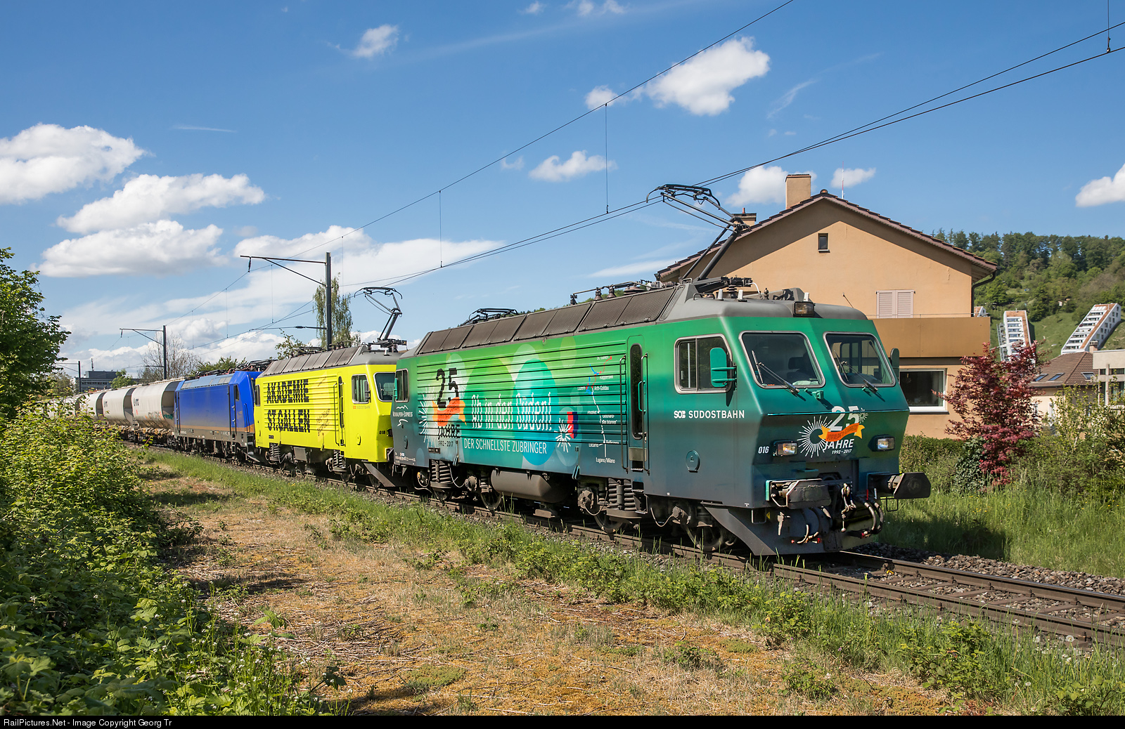 Re 446 # 016 (with publicity paint scheme for 25 years Voralpen-Express) and # 018 (publicity paint scheme for Akademie St.Gallen) of the EDG (Eisenbahndienstleister Gmbh, Thayngen) are pulling the about 1800 ton import sugar train 44087 from (probably) Poland via Basel-Bülach-Winterthur to Islikon for the Swiss sugar SA in Frauenfeld, between Winterthur Wülflingen and Winterthur Töss. Behind the two trailing locomotives is the towed Bombardier TRAXX F140 AC2 185 # 596 of the Beacon Rail Leasing, rented to the Logistik- and Transport Gmbh (LTE), which pulled the train in Germany and will pull the empty train back in a few days.