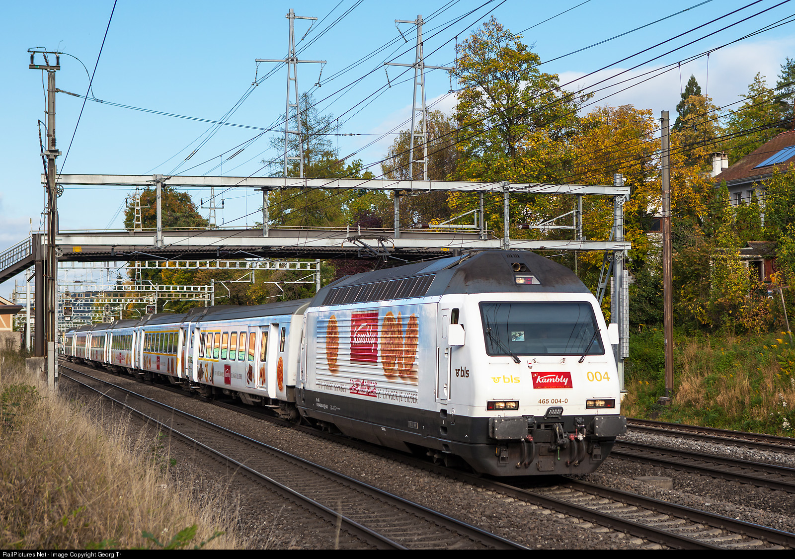 | Special train from Bern to St.Gallen to the OLMA exhibition (Swiss Fair for Agriculture and Food/Schweizer Messe für Landwirtschaft und Ernährung) with Re 465 # 004 and former SBB standard cars mark III push-pull train of the BLS, all decorated for 100 years of the KAMBLY company in Trubschachen, producing fine bisquits and selling them worldwide. This train usually circulated then between Bern and Lucerne via Langnau-Entlebuch-Wolhusen. Today it is running between Berne, Neuchâtel and La Chaux-de-Fonds mainly. |