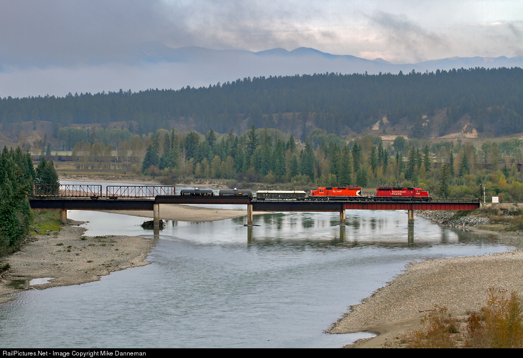 Canadian Pacific’s wayfreight between Cranbrook and Golden is crossing the Kootenay River at Fort Steele, British Columbia, on September 21, 2013.