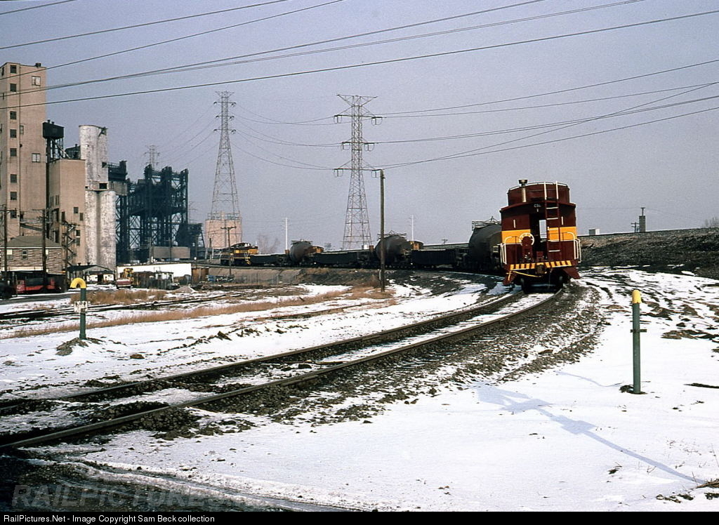 | With its former Santa Fe caboose on the rear, the Chicago Short Line is seen departing east from US Steel South Works toward the lift bridge over the Calumet River with an empty bottle train returning back to NW Indiana. Tom Golden photo. |