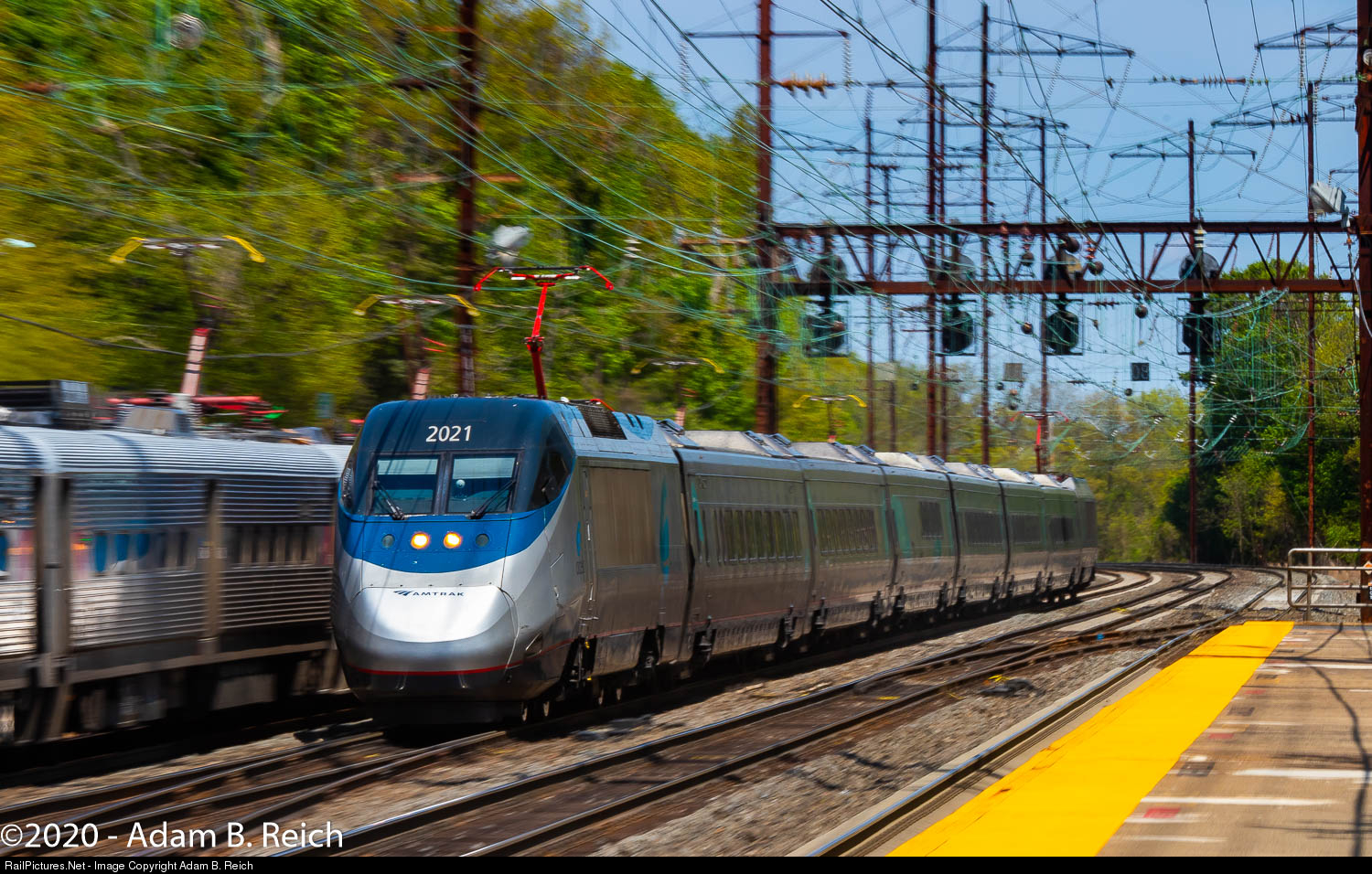 Hello Old Friend: An Acela Express set passes a westbound NJ Transit train making a stop at Metuchen, NJ on May 10, 2020. Acela Express service remains suspended due to the COVID-19 crisis, but is set to resume with three round trips on June 1st. Zoom pan shot at 1/40 second.