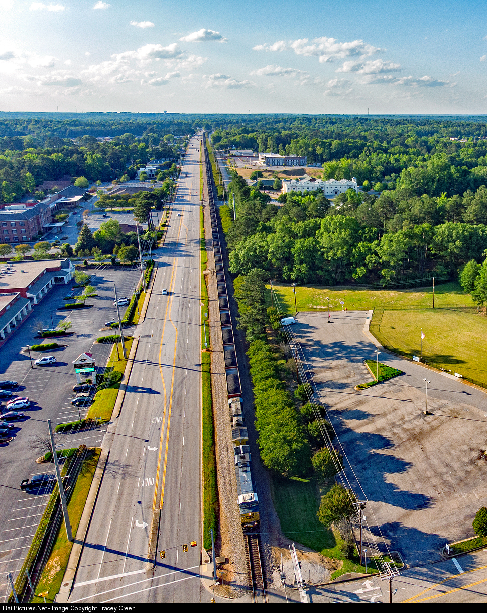 | Loaded Coal. A loaded unit train bound for Santee Cooper's Cross Generating Facility in Berkeley County, SC heads south through Irmo, SC on the historic CN&L line. |