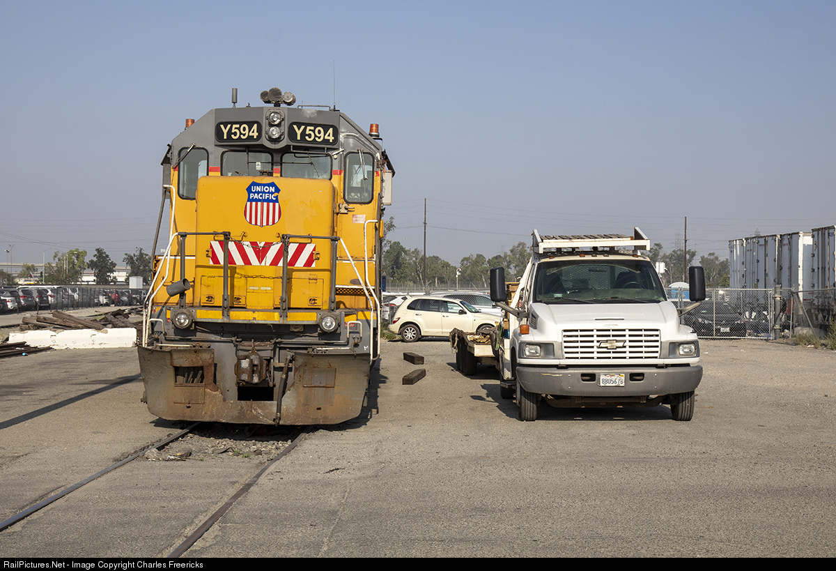 | A Union Pacific GP15-1 awaits its next assignment in the Space Center industrial park just off of Mira Loma Yard. A fellow GM graduate was parked next to it. |