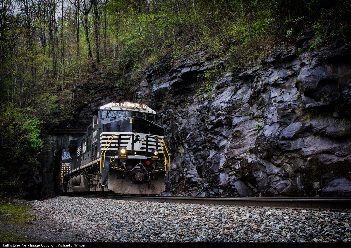 | Continuing further, we catch NS #4087 at Big Four Tunnel No. 1 outside of Big Four, WV. The railroad dips and winds its way through the valley followed closely by U.S. Route 52 and Elkhorn Creek here. |