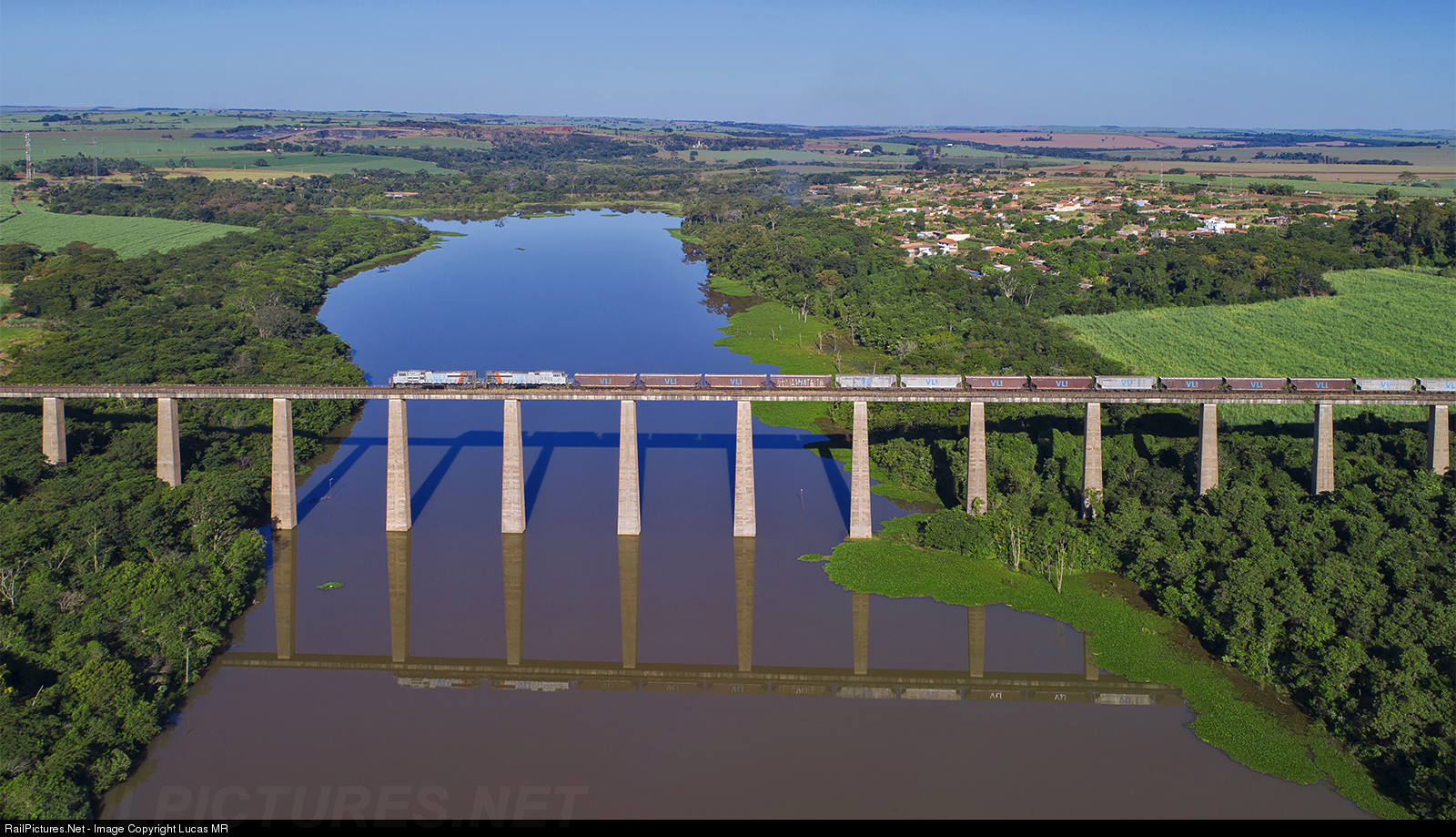 Northbound J751 double heading EMD SD70ACe-BB locomotives crosses the bridge over Sapucaí River, between São Joaquim da Barra and Guará cities.
