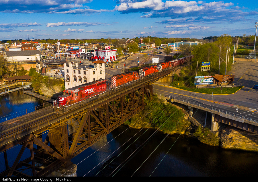 | It's a beautiful evening in Wisconsin Dells as a quad of Canadian Pacific SD40-2's thunder west through town. The streets of the Dells are usually packed around this time, but COVID-19 has taken its toll as the entire town was scary quiet. |