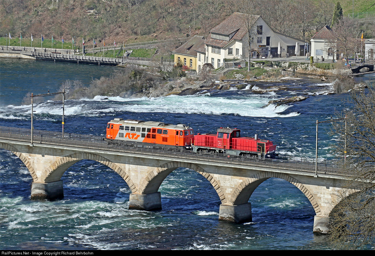 | The former OBB Austria Rail diesel locomotive heads a red Am 841 of SBB from Schaffhausen to Winterthur. Both locomotives are used for working trains. |