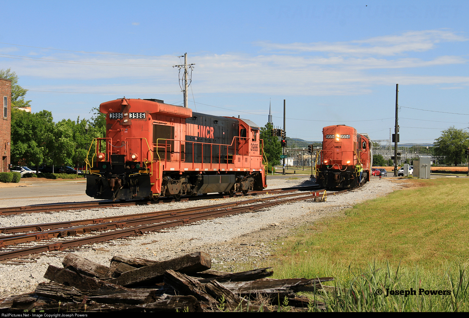 Huntsville and Madison County Railroad Authority U23B HMCR 9554 with two covered hoppers in tow is about to pass B23-7 HMCR 3986 in the railroad's yard in downtown Huntsville, Alabama. Both locomotives brought the two covered hoppers north. The 3986 was cut off and put into a siding so that it could be used to switch cars from the south end of the yard once the rest of the train clears.