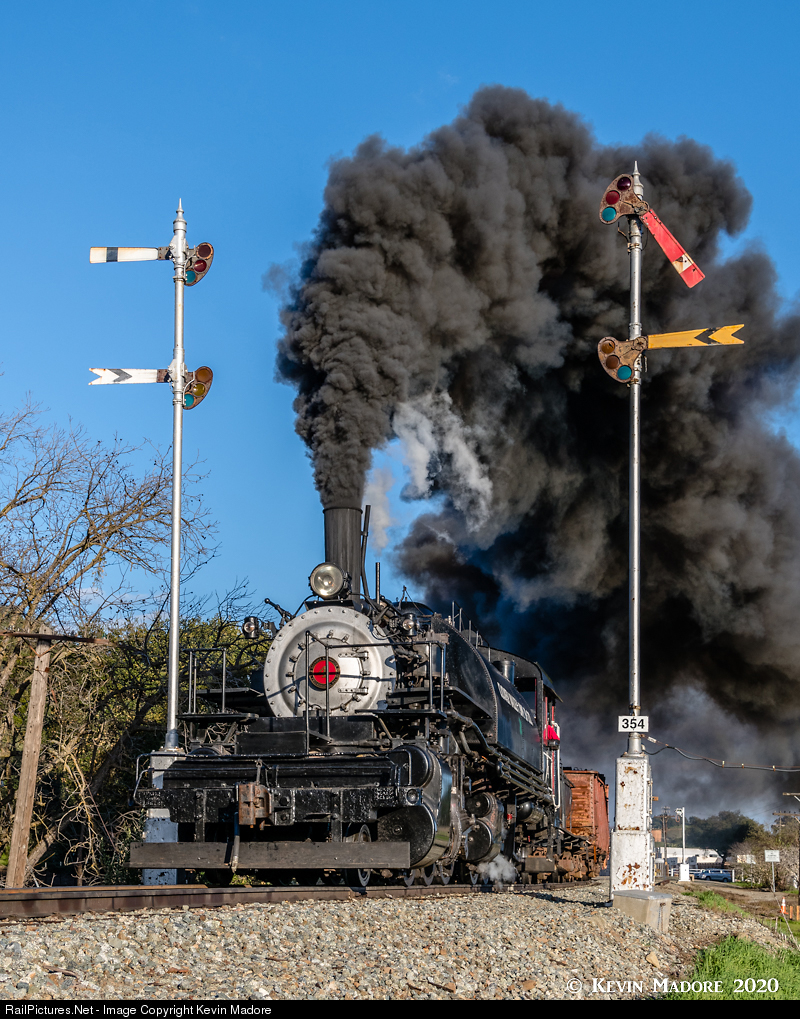 Splitting the signals. Spewing out a plume that would make Beebe & Clegg smile, Clover Valley Lumber Company's saddle-tanker #4 splits the twin semaphores just west of Sunol Depot, in the late afternoon sun, trailing a mixed local freight. The semaphores pictured here are apparently not original to the line. As the story goes, when the SP pulled out, they pretty much took everything with them. The Pacific Locomotive Association (PLA) folks who operate the Niles Canyon Railway have methodically been working to restore many of the features of the line and these signals are part of that. My understanding is that these were obtained from a location someplace in Arizona. They look right at home on this winding stretch of the original Transcontinental Railroad, built back in 1869.