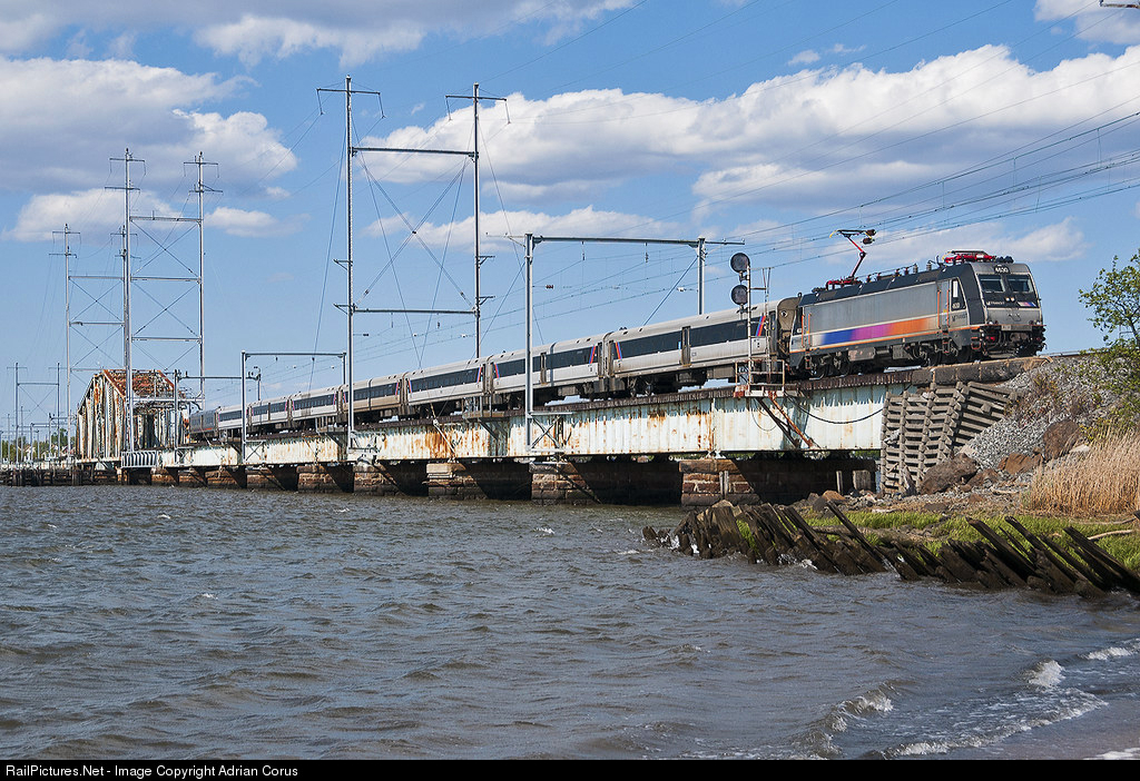 Built in 1908 by the Pennsylvania Railroad, the Raritan River Drawbridge, "River Draw", is the sole rail link for 17 of the 20 rail stations on NJ Transit's North Jersey Coast Line (NJCL) and spans the distance between Perth Amboy and South Amboy, NJ about a half a mile from where the Raritan River meets the Atlantic Ocean, carrying an average of 10,000 NJ Transit costumers a day. A new bridge will soon be built to replace the existing swing bridge, which suffered severe damage during hurricane Sandy. The bridge is seen here carrying a westbound New York to Long Branch local over the waters of Raritan Bay on a windy late Spring afternoon.