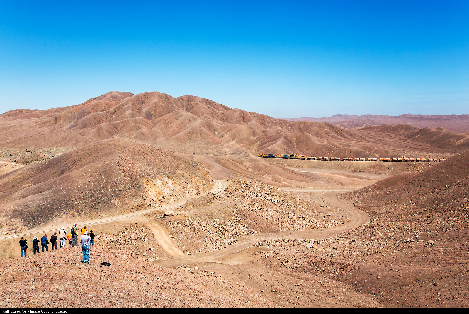 Railfans from Switzerland, Germany and Austria of the Tanago tour are waiting for the loaded sulphuric acid tank car train of the FCAB, which is tackling the grade of the Cumbre pass on the way from Mejillones to (probably) Chuquicamata. Pulling are GL26C # 2006 (former Queensland Government Railway QGR # 2108D built by Clyde in 1971) and GR12UM # 1414 and # 1413, former Canadian National Railway EMD NF210 # 936 and # 926.