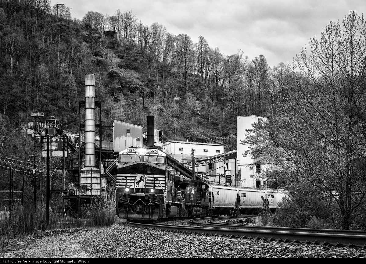 | After Welch we drove east back to Keystone to catch NS #9275 hauling an empty grain train past an abandoned coal processing plant in Keystone, WV. There are literally dozens of coal plants like this dotting this area, a sign of the downturn and fall of the coal industry that was once vital to this area. Notice the coal cart hauling system going up the mountain in the background. |
