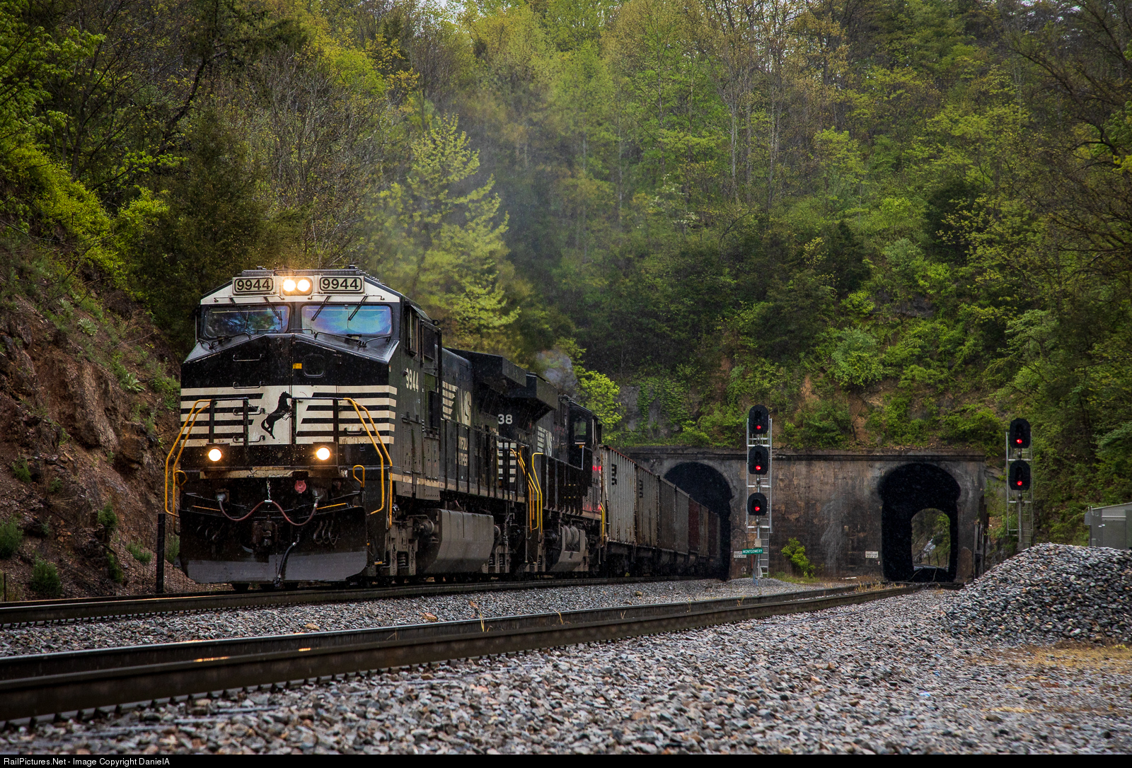 | A dash-9 leads empty coal loads, NS 813, out of Montgomery tunnel as a steady rain falls. |