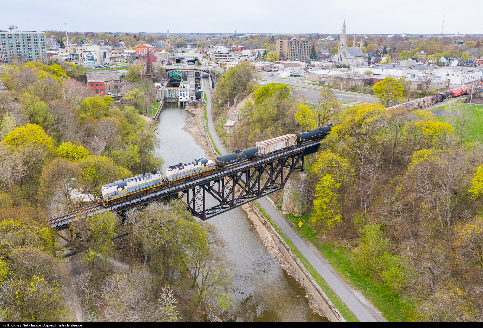 With an unusually long train, a double header of an Alco RS-11 and RS-32 lead the eastbound Falls Road Railroad local as it begins its day heading out of Lockport, New York. The train is crossing over the Erie Canal on the "upside down" truss bridge. The canal's locks can be seen cutting through downtown in the background.