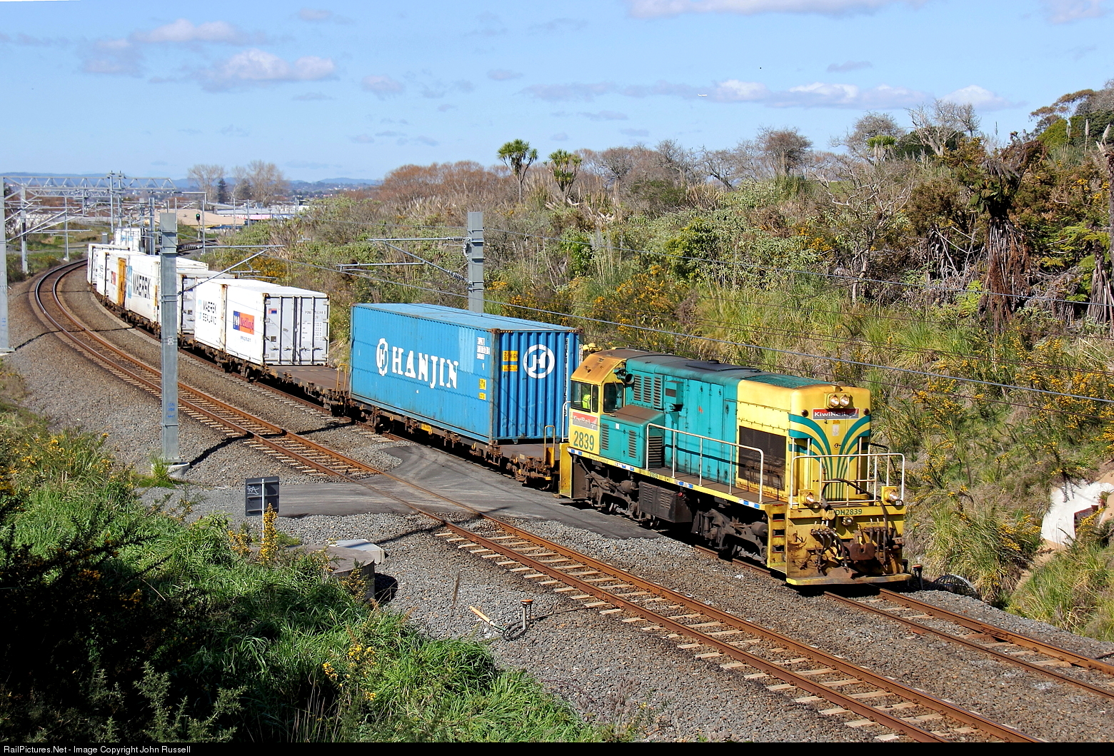 | 2839 was one of the last locomotives in service with Toll "corn cob" livery. Built in 1978 by General Electric USA, these locomotives are used for shunting and port transfer trains. Toll operated trains from 2003 to 2008 when the NZ Government bought back the rail business and vested it in KiwiRail. The train to Auckland Port enters Purewa tunnel. |
