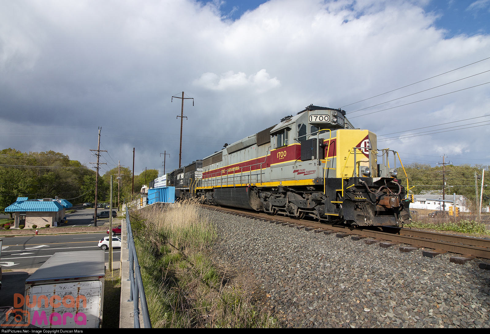| Conrail OI-16 runs south on the former Camden and Amboy Railroad at Parlin, NJ with the NS 1700 painted in its Erie Lackawanna colors leading the way. The train catches a period of bright sun on a day consisting of on and off snowy conditions. |