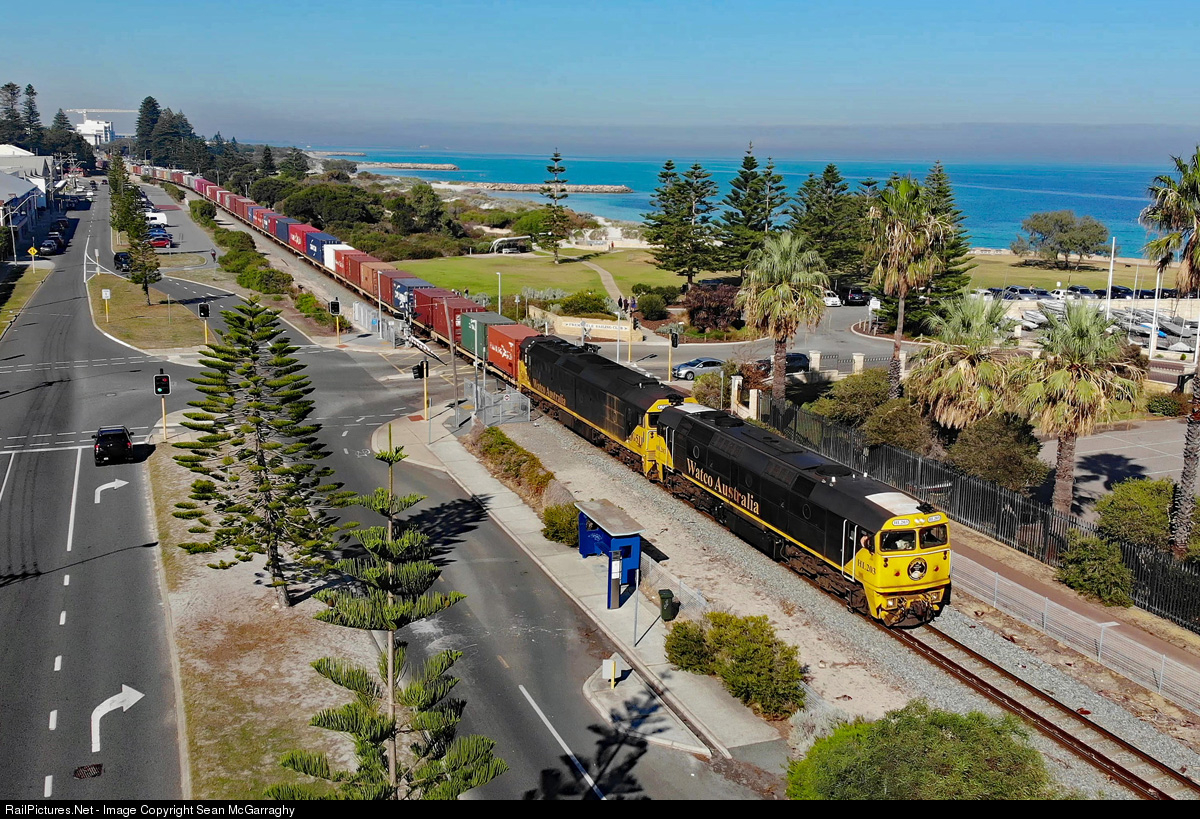 | The Watco ILS container train 6142 passes the South Fremantle Dog Beach with a service bound for North Quay Terminal from Forrestfield MGC. HL203 & G511 have the honours on this occasion. The crew having just been greeted by some friendly beach-goers and exercisers as is usually the case when they pass through Fremantle. |