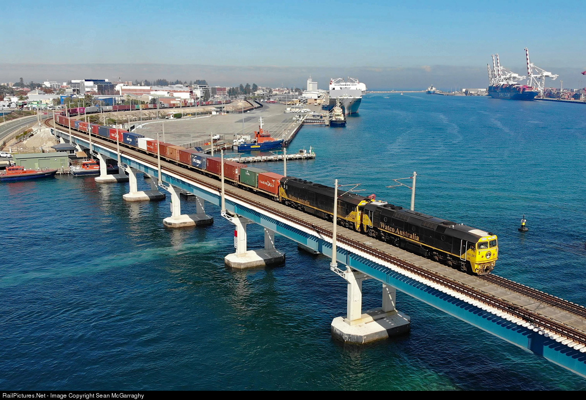 The Port of Fremantle is in view as HL203 & G511 traverse the Swan River rail bridge in Fremantle. 6142 Watco ILS container train from Forrestfield MGC is on the last, and most scenic stretch of its short run to North Quay Terminal.
