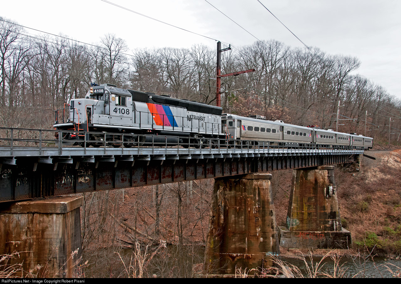 NJT X4108 shoves across the Passaic River in Millington, NJ. 4108 was shoving a set of Arrow IIIs from Gladstone, NJ to the MMC after one unit of a married pair suffered truck damage in a derailment within Gladstone Yard several days prior. The pair was severed, with the other half able to make a shop move earlier. This move required the use of a dolly on one axle, which required restricted speed for the entire eastward move.