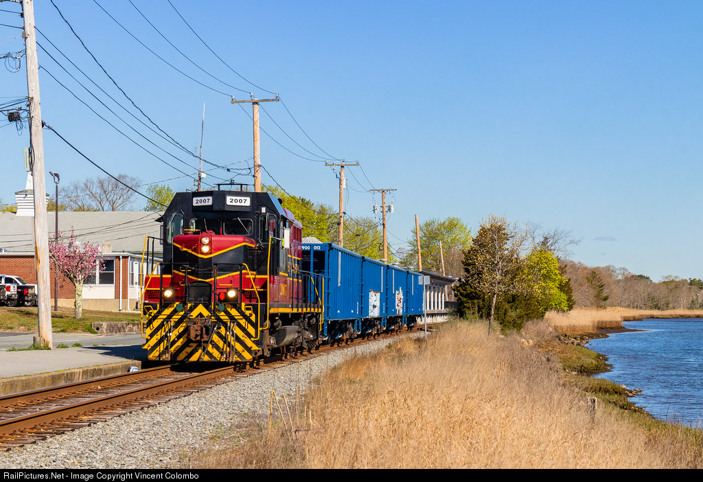 | Mass Coastal 2007 (ex-ATSF GP9u) leads a small, loaded ballast train along the Wareham River in Wareham, MA. |