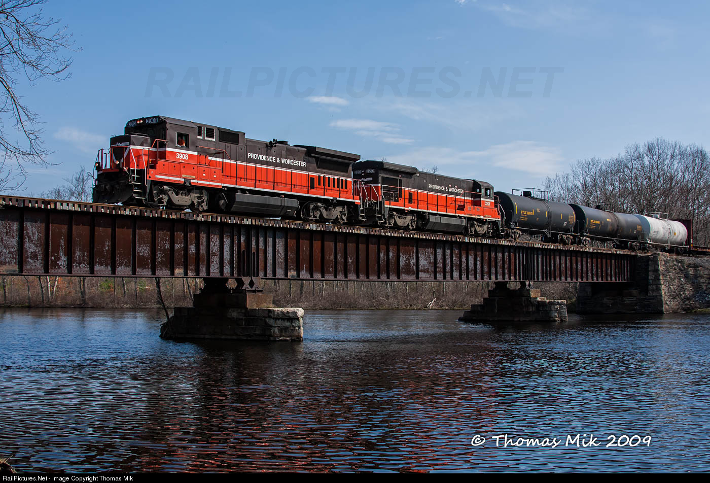 Providence & Worcester RR B39-8 no. 3908 and B23-7 no. 2201 lead westbound train NR-4X, crossing the Shetucket River on the Willimantic Branch at Canterbury, CT on April 26, 2009.