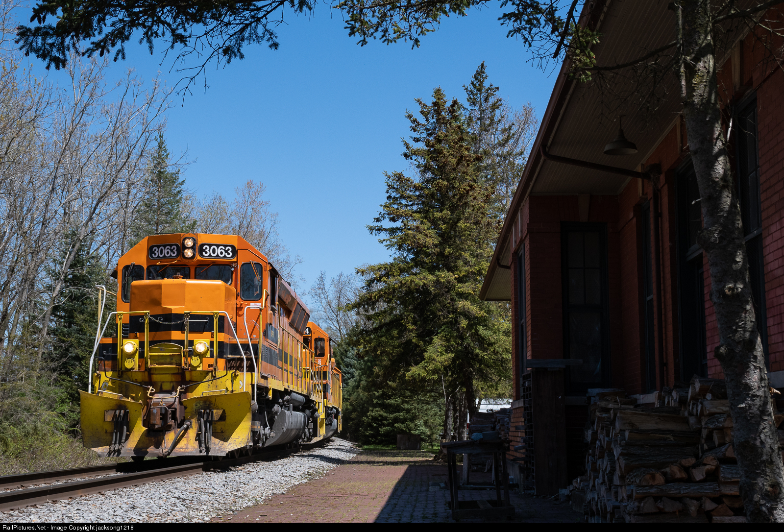 | Rochester & Southern train GW-1 passes the passenger station in Scottsville, NY with BPRR 3063, an ex SP SD45, leading the trio of six axle EMDs. |