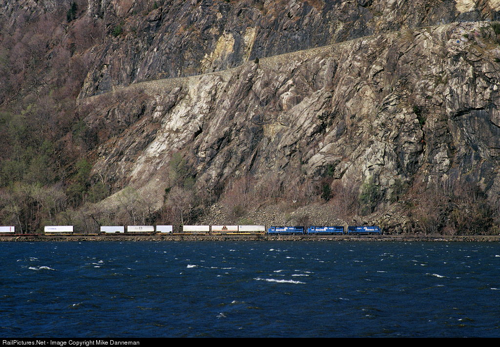 On a windy April 11, 1991, spring day on the Hudson River, a northbound Conrail TV (Trailvan) intermodal train rumbles beneath Storm King Mountain as it approaches Cornwall-On-Hudson, New York. Powering the train along the choppy waters of the Hudson is a trio of GE locomotives—B36-7 No. 5006 and B40-8 Nos. 5074 and 5086. Some amazing rock work can be seen above the train supporting Highway 218 around the nose of massive Storm King Mountain.