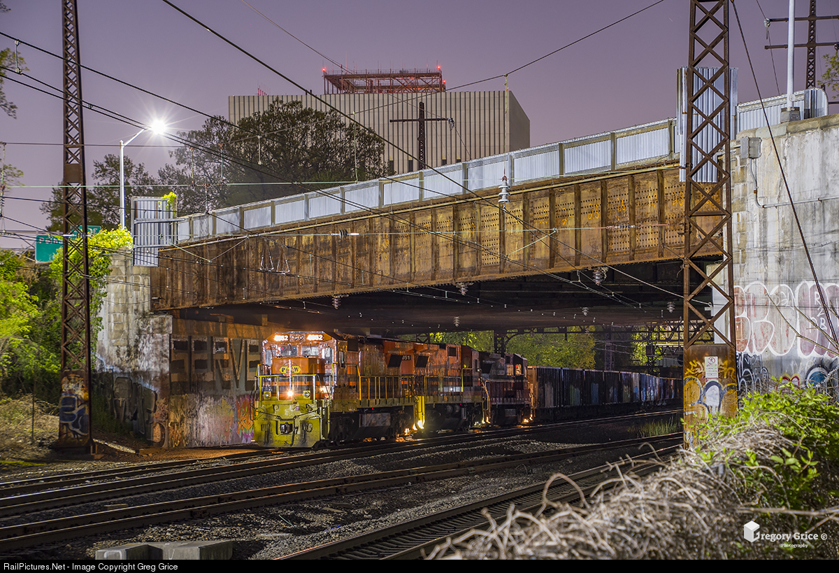 Providence & Worcester FPCH holds at under I-95 at Pelham Bay Interlocking on Amtrak's Hell Gate Line. Once Amtrak Regional 148 passes, they will head east to Metro North's New Haven Line and continue on to Cedar Hill Yard in New Haven. |