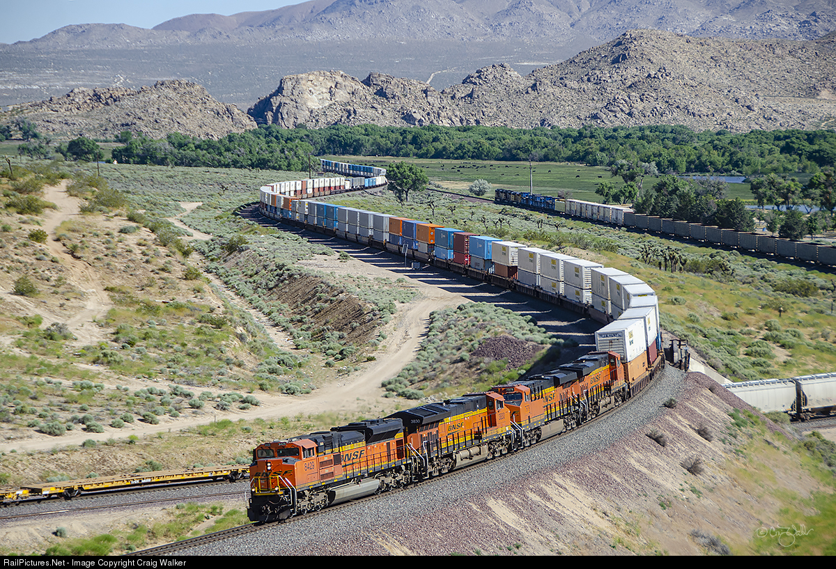 Just south of Victorville, California, the Mojave River cuts through the hills. The Atchison Topeka & Santa Fe Railway took advantage of this natural river engineering to get their rails through as well, and when this line was double tracked years later, a "natural crossover" was constructed at Frost. This allowed trains to position themselves without block any opposing traffic, as nearby Cajon Pass featured left-hand running to take advantage of the newer, gentler grades for uphill running, and the steeper, original grade for westbound, downhill, operations. On a very pleasant spring morning, BNSF Railway train Q-ALTLAC1-12 crosses over a Union Pacific eastbound train (UP has trackage rights here) as it ticks off the last hundred miles (or so) from Alliance TX to Los Angeles. (Victorville, California – May 15, 2020)