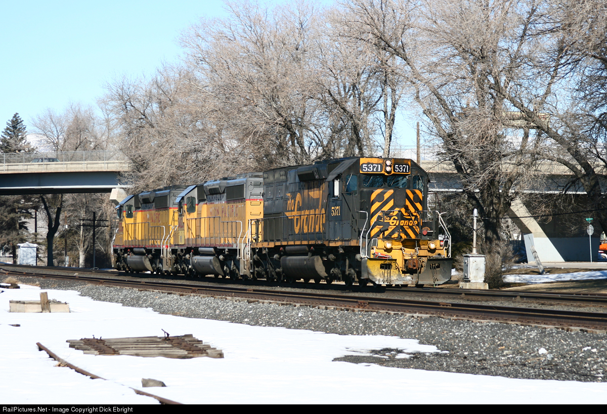 Time is running out for the DRGW 5371. It is seen here along with two Union Pacific SD40-2’s rolling through downtown Price, Utah on its way to Wash siding to pick up its train. Today’s train will be 5371's the next-to-last Dirt Train. In just a few days it will lead its very last Dirt Train local from Helper to East Carbon City, Utah. Then, after a trip to Denver it went to the Utah State Railroad Museum in Ogden, where it is today.