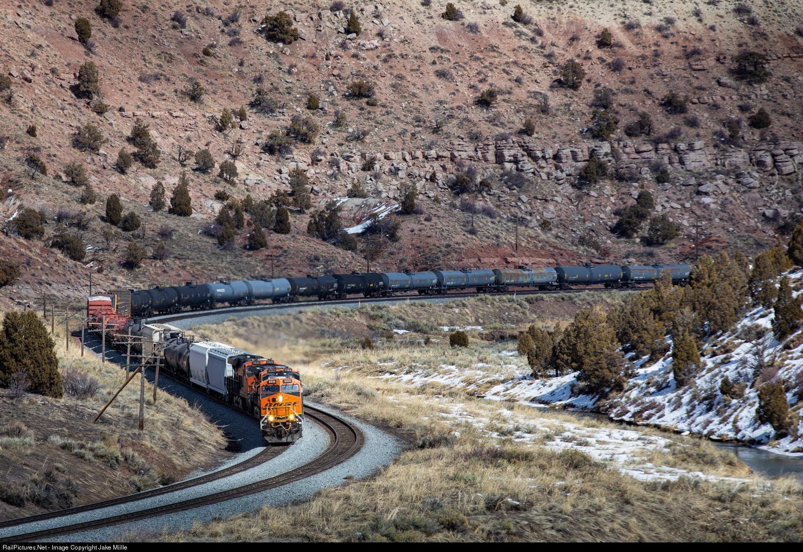 | BNSF 6935 follows the Price River as it ascends towards Soldier Summit on a cold winter afternoon. The 75-car train will soon top out at over 7,400' before beginning its descent towards Provo. With an overall decline in coal, train traffic over the infamous Soldier Summit has drastically declined. While the route is still owned by the Union Pacific, BNSF appears to utilize this route as much as the home railroad. |