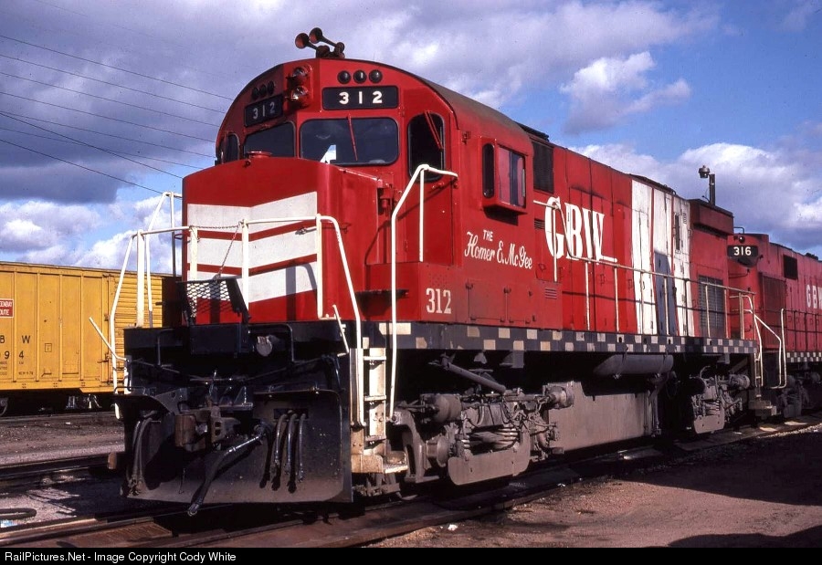 | Green Bay and Western C424 312 "Homer E. McGee" at Wisconsin Rapids October 1982. Built in July 1964 and named after Homer McGee, former president of the GBW from 1934-1962. This was the only GBW diesel to get painted with the white chevron scheme. It was eventually painted into the standard solid red scheme but kept the name on the cab. Patrick Wendt Photo from my collection. |