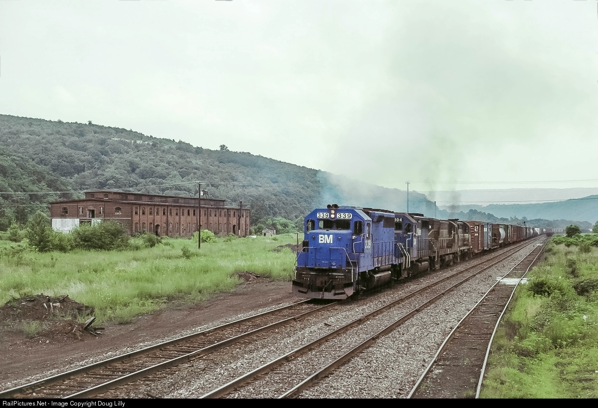 With the hulk of the Lehigh Valley Packerton car shops standing silent sentinel over the site of Lehighton yard, a northbound Delaware & Hudson train rolls through Packerton, Pennsylvania. A former Conrail GP40 patched for Boston & Maine leads a B&M GP40-2, a D&H U23B, and a D&H RS36.