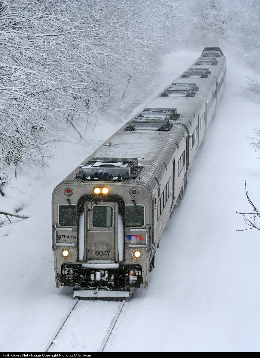 NJT 1074 makes its way east on the Montclair/Boonton Line on a snowy March morning. NJT 4525 (ALP45DP) is on the rear.